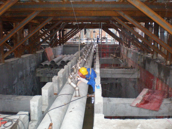 針對(duì)作業(yè)面在地下負(fù)二層,光線較差、通風(fēng)不暢,同時(shí)土建單位正在拆除臨時(shí)支撐,施工現(xiàn)場(chǎng)工作環(huán)境相當(dāng)惡劣等情況。為保證現(xiàn)場(chǎng)施工正常有序的進(jìn)行和施工人員身體健康,項(xiàng)目部采取相應(yīng)措施保證了整個(gè)現(xiàn)場(chǎng)的安全、照明、通風(fēng)。施工人員發(fā)揚(yáng)四化建吃苦耐勞、敢打敢拼的精神,長期冒雨作業(yè)。吊裝中有吊機(jī)運(yùn)行不到的地方,就積極開動(dòng)腦筋,用技巧、經(jīng)驗(yàn)和人力,保證前期設(shè)備及管道的吊裝倒運(yùn),為后期的施工做好了良好的鋪墊。