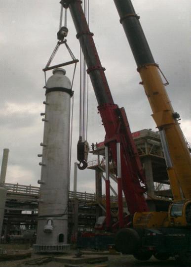 這樣的笑容來之不易。3臺反應器,最高的有19米多,單臺重量最大達到141余噸。總包單位在設計的時候未考慮吊耳。由于材質特殊,也無法在設備上施焊增加吊耳,這是最棘手的。總包單位束手無策,但又不同意項目部提出采用鋼絲繩捆綁式的吊裝方案,猶豫著不愿意簽字,萬一有個失誤,后果不堪設想!為了這次吊裝,江蘇分公司給予了大力支持,派出了經驗豐富的起重吊裝專業工程師,多次到現場、到基地與總包單位反復論證方案的可行性。激烈的討論、嚴謹的計算、類似業績的展示……一次又一次的努力,項目部滿滿的信心和十足的把握最終讓總包單位同意了這個方案。