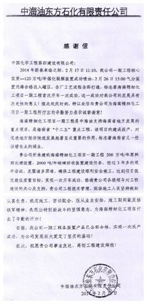 自2010年8月11日開工以來,項目部在分公司經理陳文彬、項目經理劉興陽的領導下,艱苦奮戰、精心組織、精細管理,工程整體形象良好、工程建設程序規范、質量控制到位,于2013年9月28日按期順利實現機械竣工。通過投料試車,該項目達到一次試車成功、生產出合格產品的良好效果,受到了中海油東方石化有限責任公司的來信稱贊。