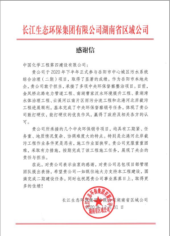 1月1日,新年的第一天,公司岳陽中心城區(qū)污水項目部收到長江生態(tài)環(huán)保集團有限公司(湖南省區(qū)域公司)送來的感謝信。在信中,業(yè)主對公司岳陽污水項目部管理團隊提出表揚,對工程建設過程中面對工期緊、任務重、地質情況復雜、協(xié)調難度大等諸多困難,特別對建筑片區(qū)施工的北港河北岸截污工程克服重重困難、采取有力措施按期完成工程施工任務表示肯定,稱贊公司敢于擔當、能打硬仗,展現(xiàn)了央企的責任與擔當!業(yè)主對公司各級領導表示衷心的感謝和誠摯的節(jié)日問候,希望公司一如既往地支持工程建設,圓滿完成岳陽市中心城區(qū)污水二期建設任務。