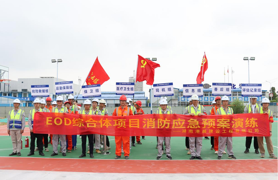 為進一步提高建筑工地人員的自救防范能力,有效處置施工現場突發火災事故, 杜絕安全事故發生。近日,港晨公司EOD項目部組織開展消防安全應急救援演練。