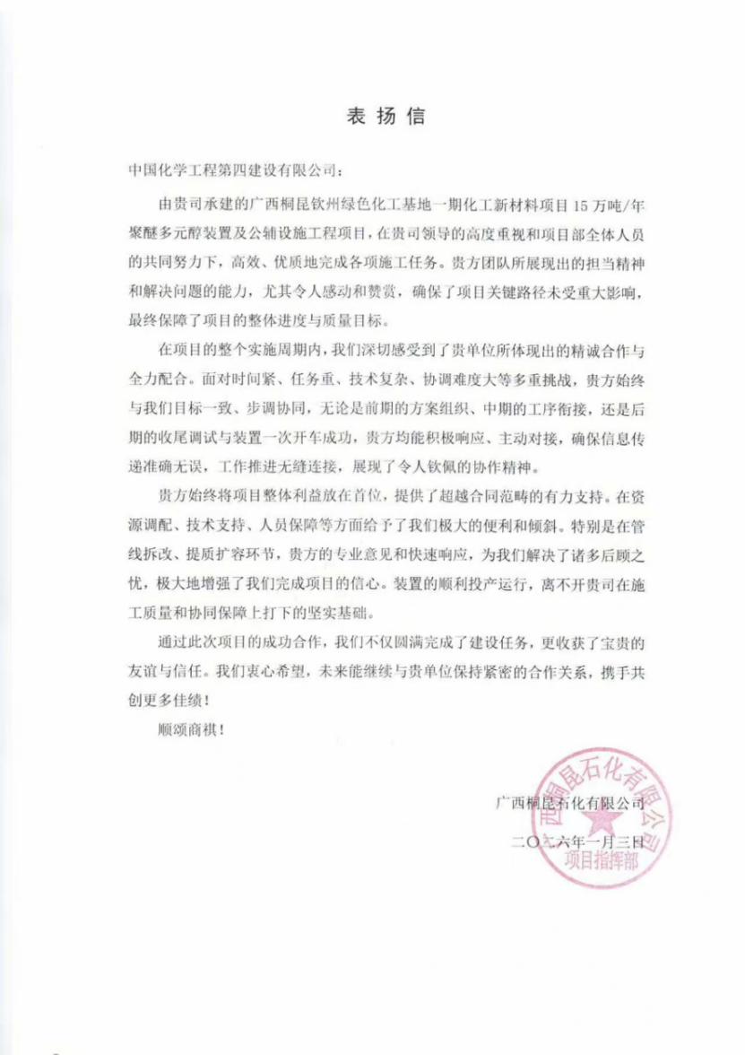 近日,華北公司收到廣西桐昆石化有限公司發(fā)來的表揚信,對華北公司在廣西桐昆欽州綠色化工基地一期化工新材料項目15萬噸/年聚醚多元醇裝置及公輔設(shè)施工程建設(shè)中的出色履約給予高度評價。