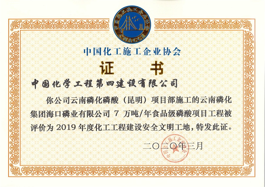 5月21日,西南分公司收到中國(guó)化工施工企業(yè)協(xié)會(huì)頒發(fā)的云南磷化海口磷業(yè)有限公司7萬(wàn)噸/年食品級(jí)磷酸項(xiàng)目“2019年度化工工程建設(shè)安全文明工地”證書。