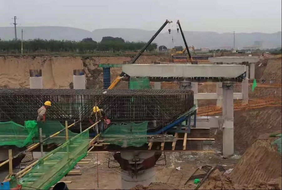 正在建設中的夏緯七路2期工程為全長3.32公里的市政道路,需填挖土方33.4萬方,其中市政橋梁兩座,路面下市政管網眾多,排水、給水、再生水、綠化、電力、通訊、路燈及行車指示牌都要按工序分層交叉施工。兩座橋梁跨度分別為150米和90米。目前橋柱及上部蓋梁基本完成,橋面梁單片長30M米、重90噸,共計90片跨梁,己完成40%片梁生產制作。
